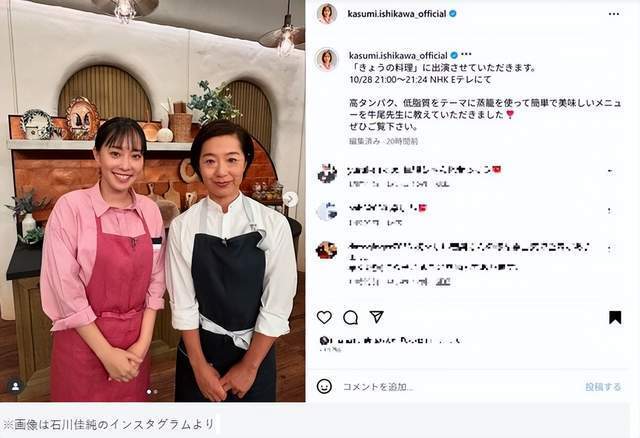 此外,石川佳纯于10月28日更新了Instagram,公开了自己身着可爱围裙的照片,引发了粉丝的热烈反响。石川佳纯投稿了出演NHK《今日料理》节目时的幕后照片,回顾录制经历说:"以高蛋白、低脂肪为主题,跟牛尾老师学习了使用蒸笼制作简单又美味的菜单。"并公开了与料理研究家牛尾理惠的合照。日本媒体称,这次罕见的围裙造型似乎引来了粉丝们接连的"求婚"评论,倘若石川佳纯结婚,或许会有大批男性大受打击。